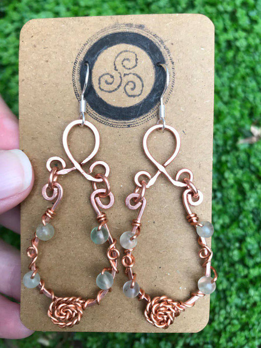 Green Fluorite Copper Rose Earrings with Sterling Silver Hooks